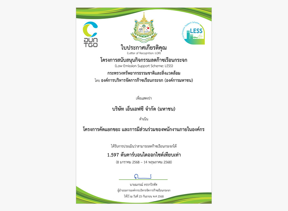 บริษัท เอ็นเอฟซี จำกัด (มหาชน) ได้รับใบประกาศเกียรติคุณจาก “โครงการสนับสนุนกิจกรรมลดก๊าซเรือนกระจก (Low Emission Support Scheme: LESS)” โดยดำเนินการ “โครงการคัดแยกขยะและการมีส่วนร่วมของพนักงานภายในองค์กร” ช่วยลดก๊าซเรือนกระจกได้ 1.597 ตันคาร์บอนไดออกไซด์เทียบเท่า ซึ่งความสำเร็จดังกล่าวเป็นผลจากการดำเนินโครงการคัดแยกขยะและการมีส่วนร่วมของพนักงานภายในองค์กร และไม่เพียงช่วยลดการปล่อยก๊าซเรือนกระจกแต่ยังสะท้อนถึงความมุ่งมั่นของบริษัทในการดูแลสิ่งแวดล้อมอย่างยั่งยืน